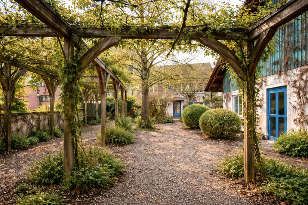 Besonders hervorzuheben ist der innenliegende Hofbereich, der als geschützter Außenraum vielfältig nutzbar ist – beispielsweise als Aufenthaltsfläche, Spielfläche, Veranstaltungsbereich oder ergänzende Außenfläche für Seminar- und Bildungsangebote.